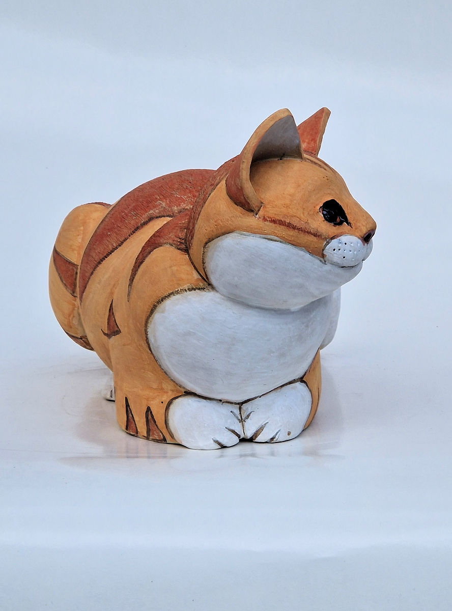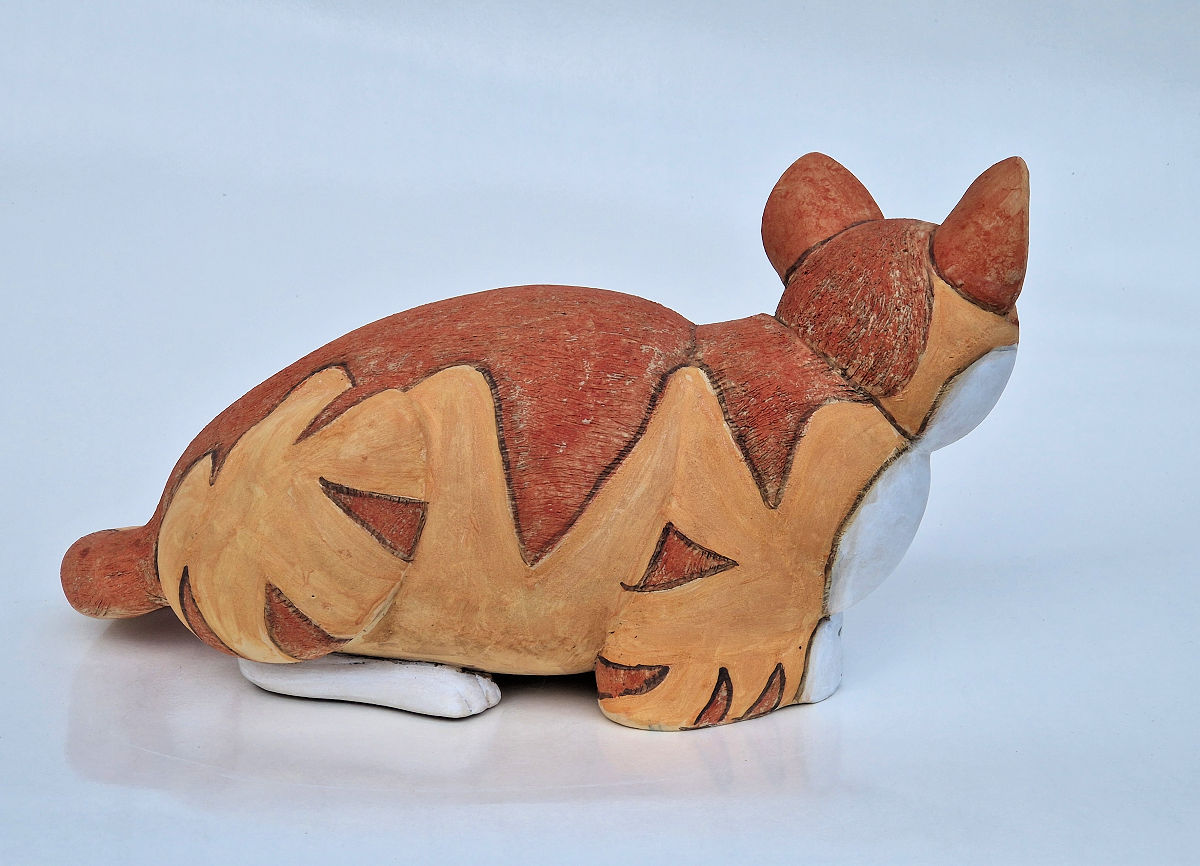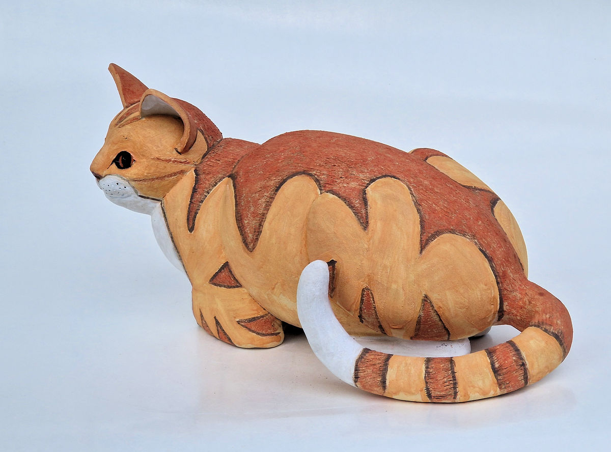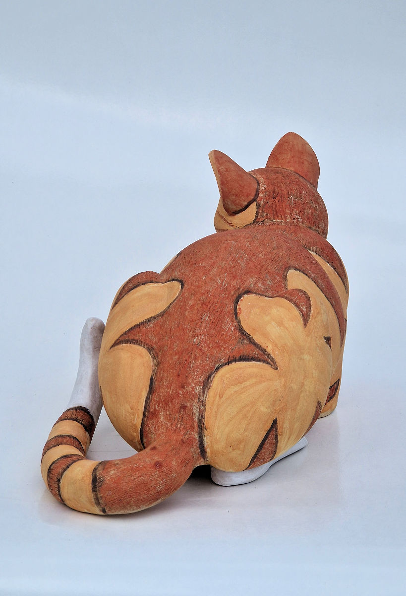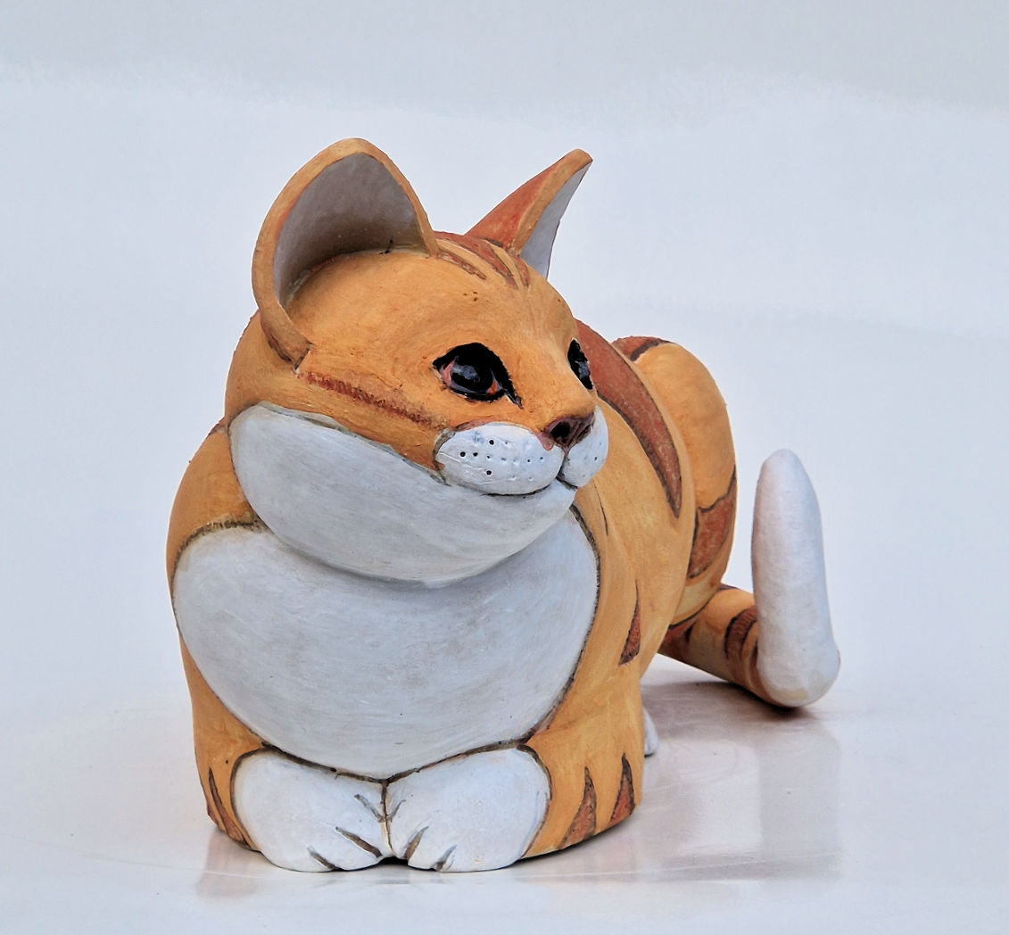 Ik heb dit najaar twee katten gemaakt die ik eens anders heb gedecoreerd. Normaal gebruik ik glazuur waarin oxides en pigmenten zijn gemengd.