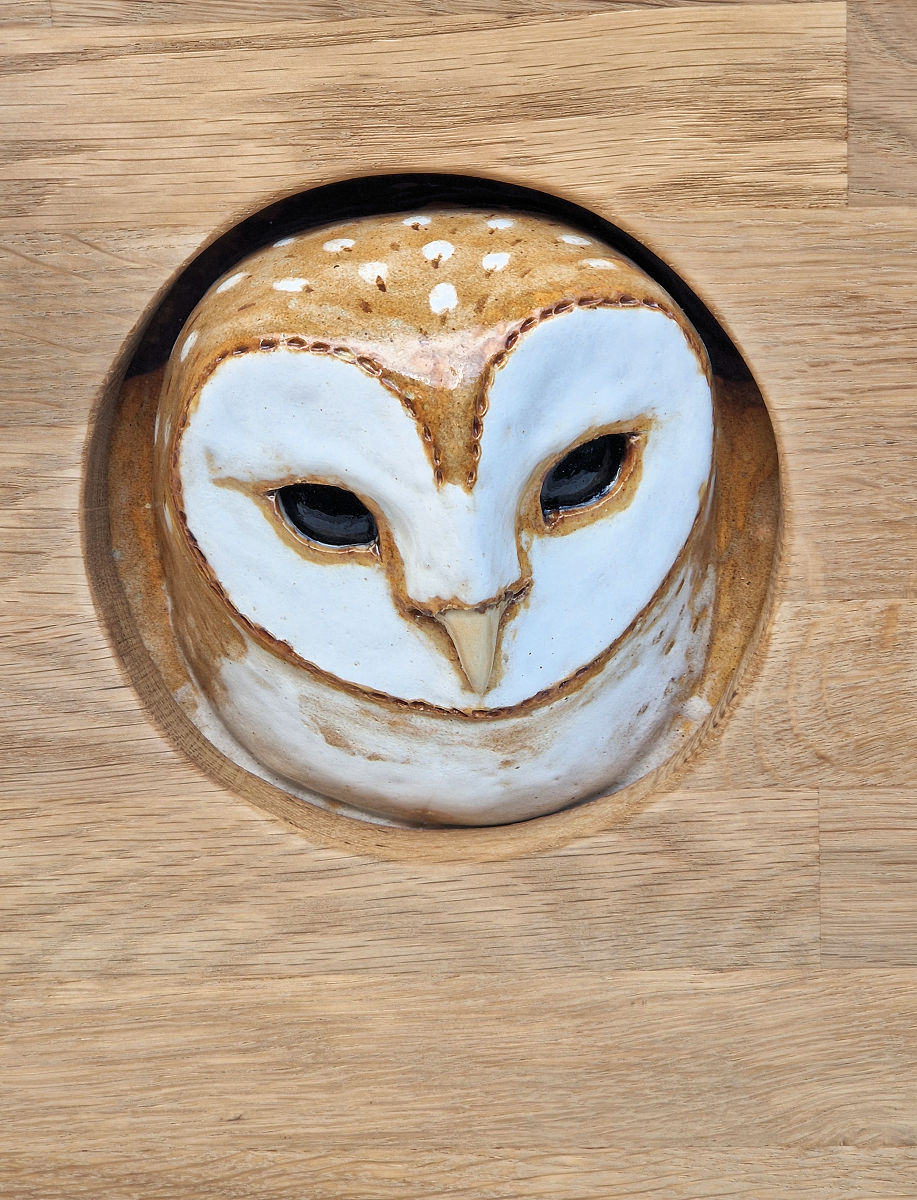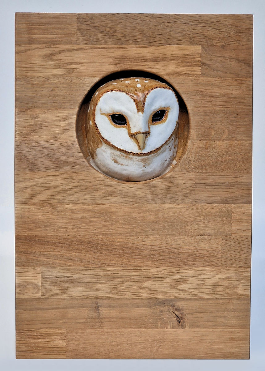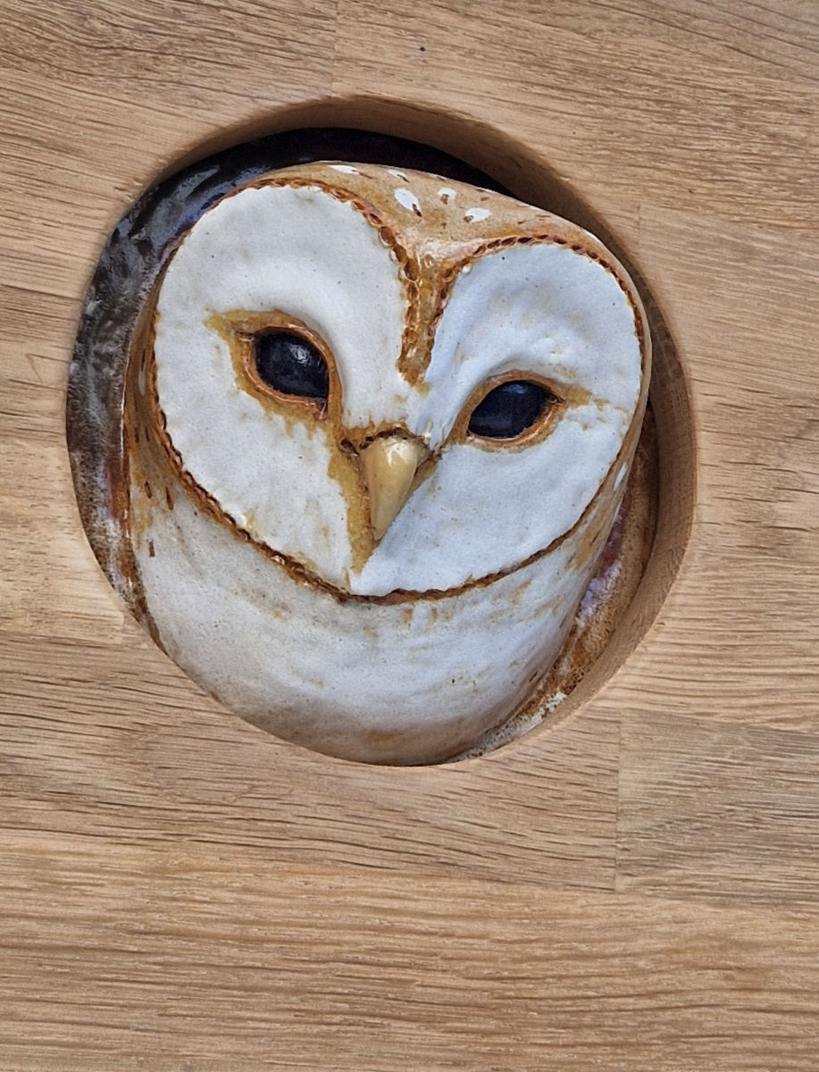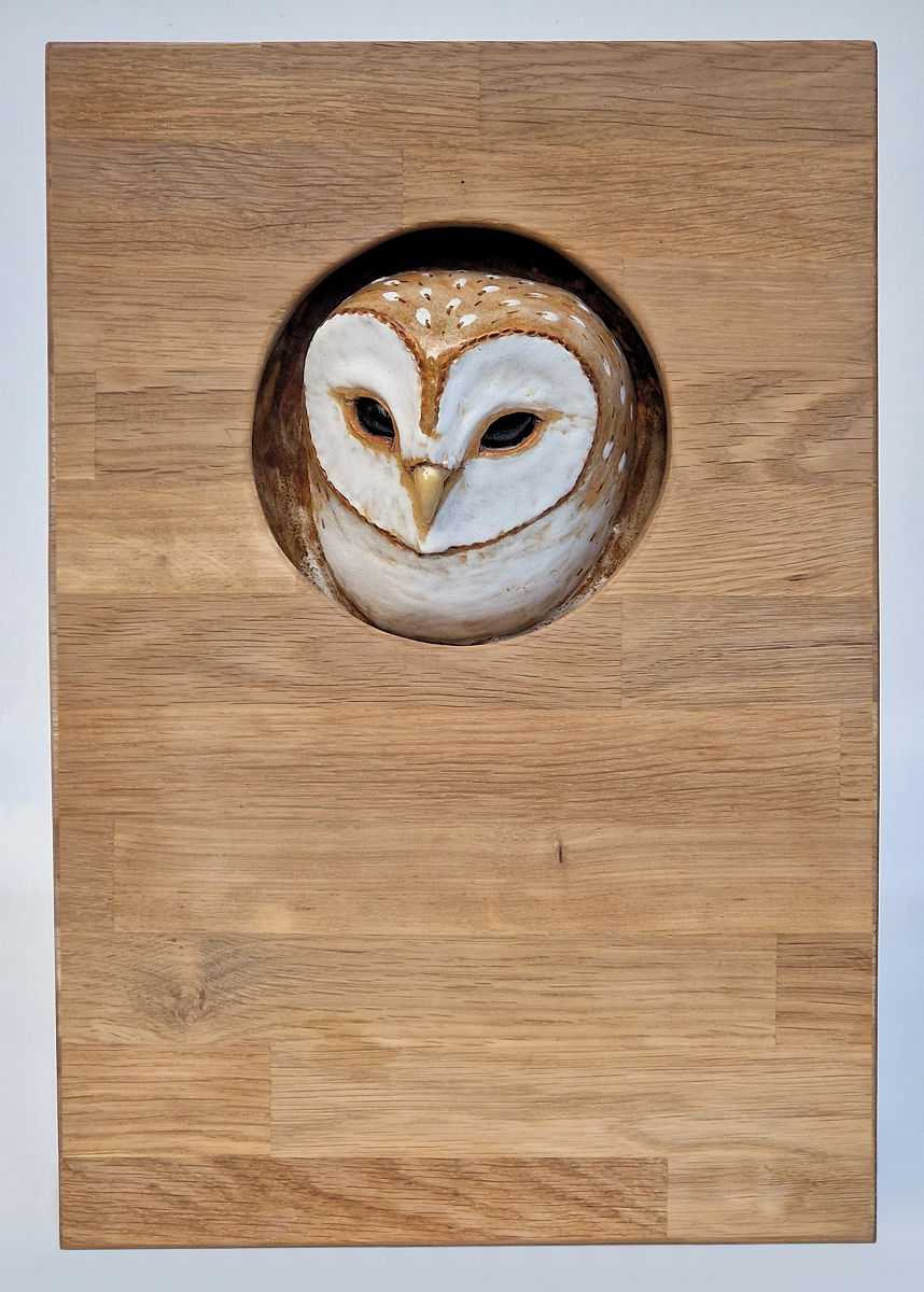 Deze kerkuilen heb ik in een beukenhouten “nestkast” bevestigd. Mooi sereen object voor aan de muur.