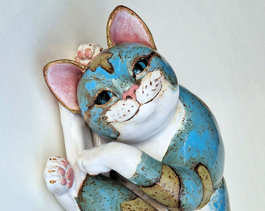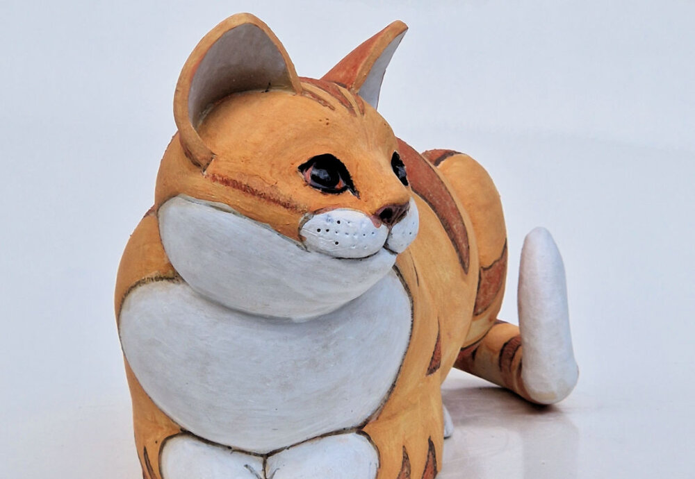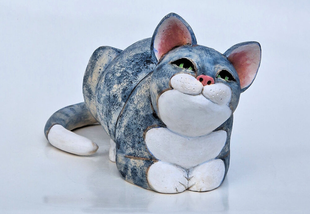 Ik heb dit najaar twee katten gemaakt die ik eens anders heb gedecoreerd. Normaal gebruik ik glazuur waarin oxides en pigmenten zijn gemengd. Maar je kunt oxides en pigmenten ook direct op de klei aanbrengen. Op hoge temperatuur smelten metaaloxides dan gewoon vast. Pigmenten worden met een kleine hoeveelheid glazuur gemengd, zodat ook die vastbakken.