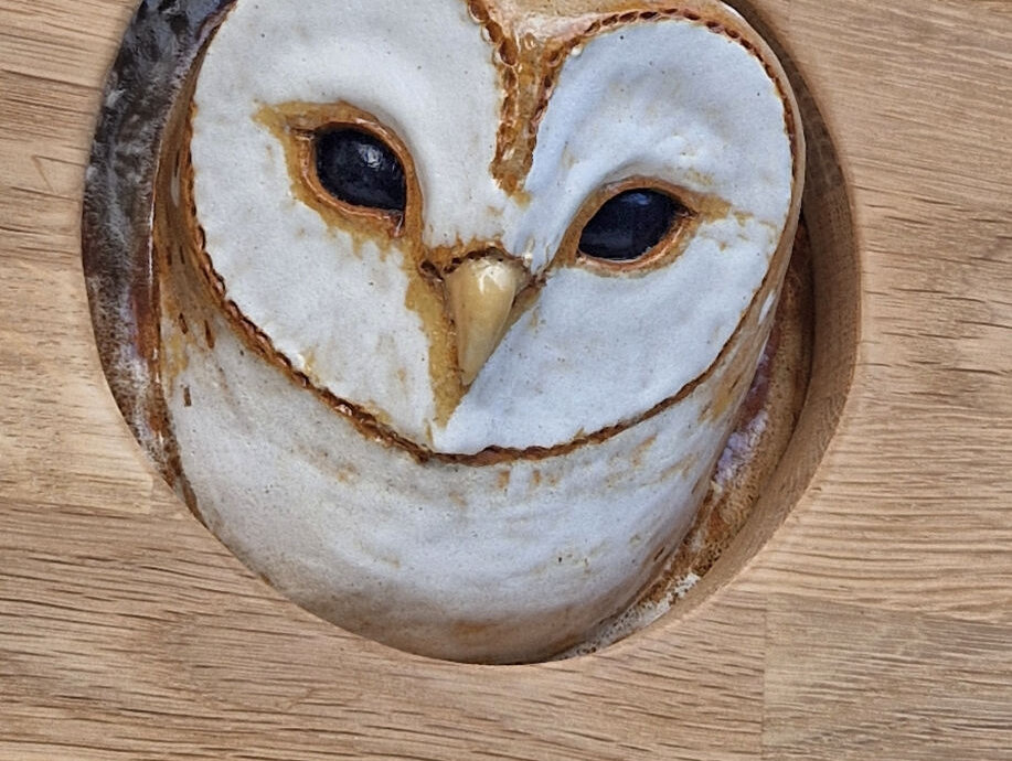 Deze kerkuilen heb ik in een beukenhouten “nestkast” bevestigd. Mooi sereen object voor aan de muur. Er zijn twee verschillende: een kijkt naar rechts, de ander naar links.
