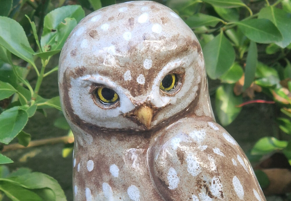 Ik heb – eindelijk – een aantal mooie, levendige steenuil-grijze glazuurkleuren kunnen ontwikkelen! Lang naar gezocht, dus ik ben er erg blij mee. Natuurlijk krijgt een steenuil behalve deze drie grijzen, ook nog een mooi wit-met-spikkels-glazuur voor de buik. En onder meer knalgeel pigment voor de oogirissen. Wat voor de snavel dan weer wat bruiner